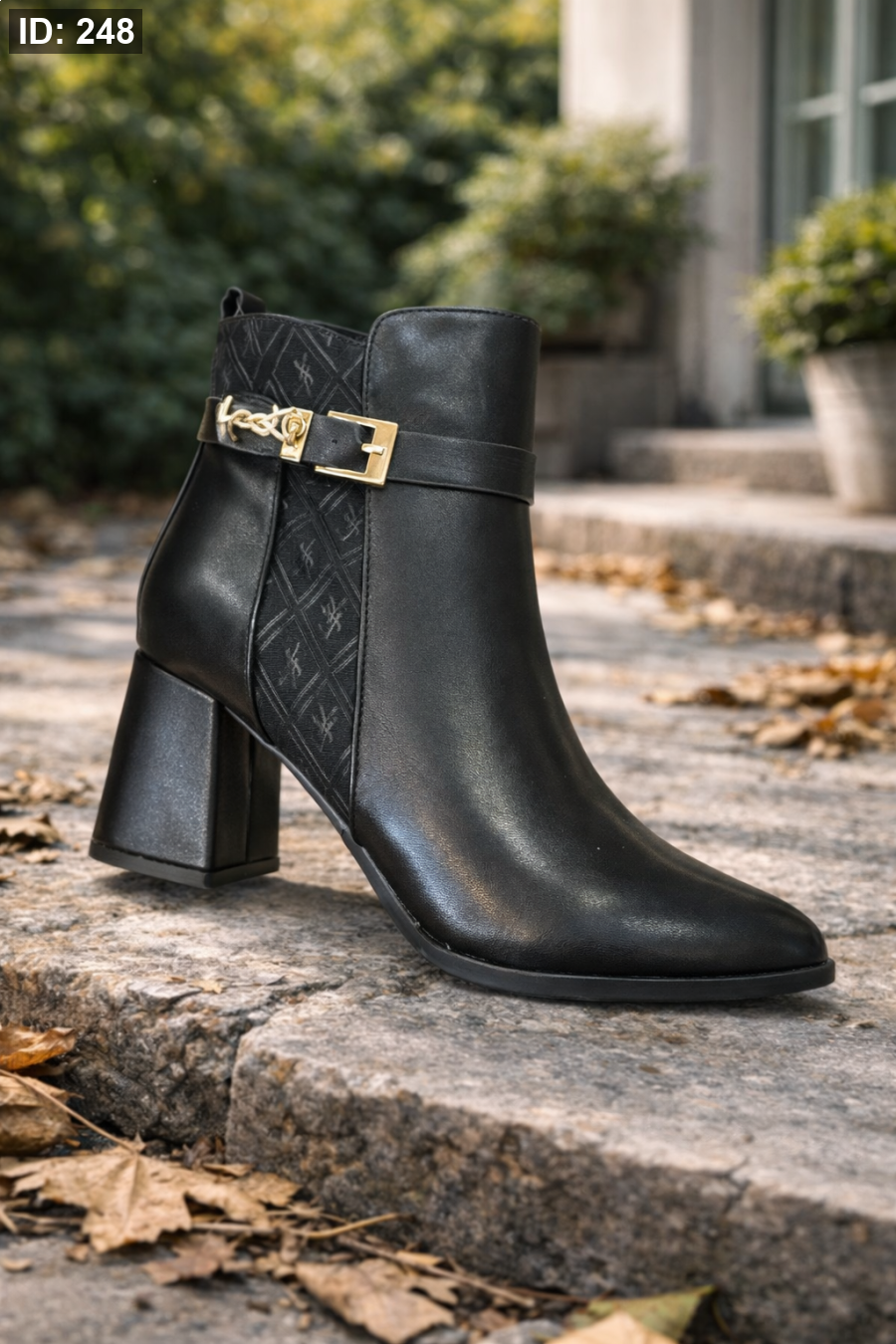 بوت نسائي كاحل جلد مع إبزيم ذهبي وكعب عريض