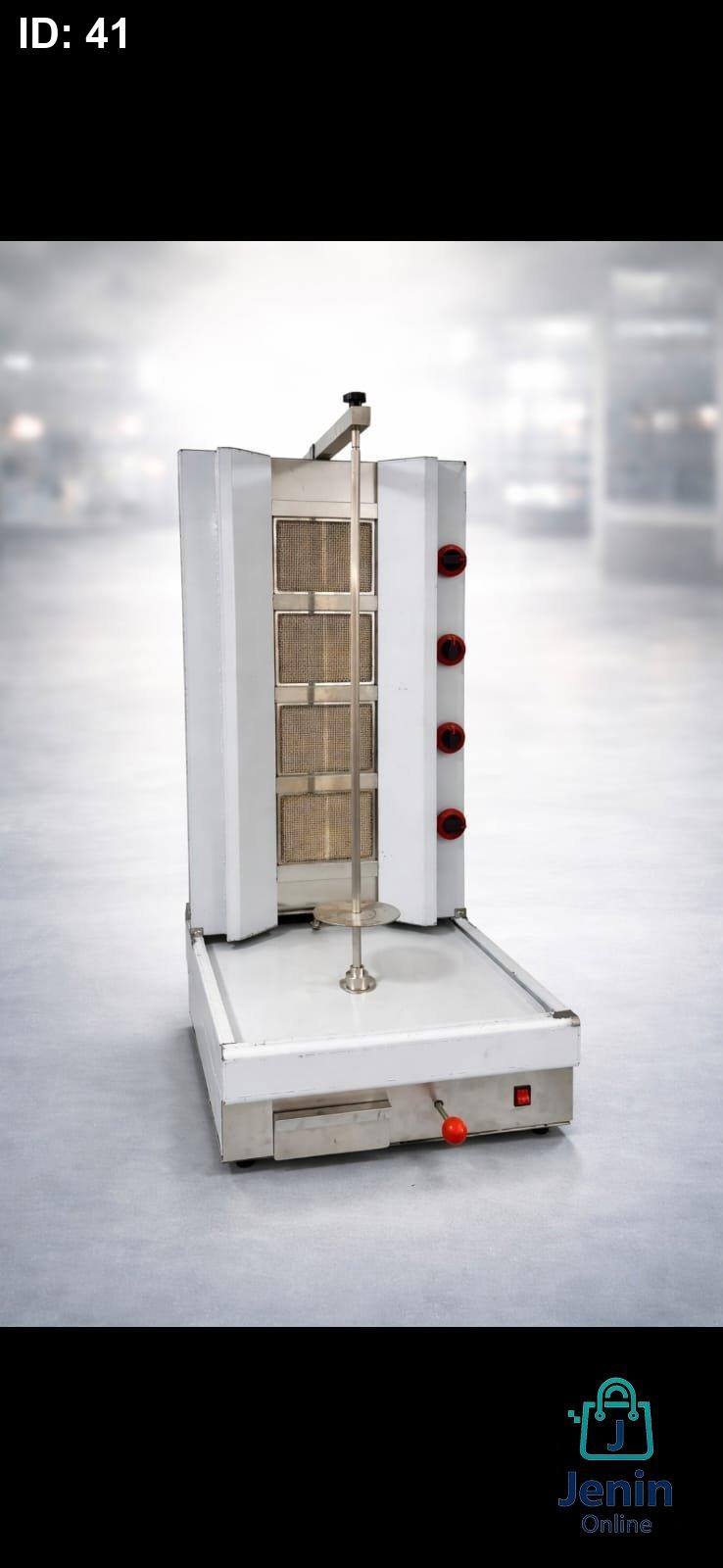 ماكينة مخصصة لشوي الشاورما، تعمل على الغاز، فيها سيخ عمودي لتثبيت اللحم مع شعلات جانبية لتوزيع الحرارة بشكل متساوي. مزودة بمقبض لتحريك ورفع السيخ حسب الحاجة، وقاعدة سفلية لتجميع الدهون. مناسبة للمطاعم والمطابخ التجارية، عملية وسهلة الاستخدام وتعطي تسوية ممتازة للحوم