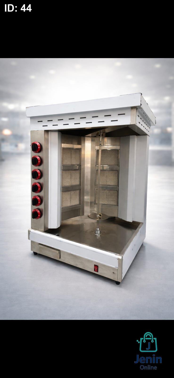 ماكينة مخصصة لتحضير الشاورما، تعمل على الغاز، مزوّدة بعدة شعلات جانبية للتحكم بدرجة الحرارة وتوزيعها بشكل متساوٍ. تحتوي على سيخ مركزي لتثبيت اللحم، مع قاعدة ستانلس ستيل لجمع الدهون، وتصميم متين مناسب للمطاعم ومحلات الشاورما. تتيح تسوية اللحم تدريجيًا مع تحكم كامل بدرجة النار حسب الحاجة