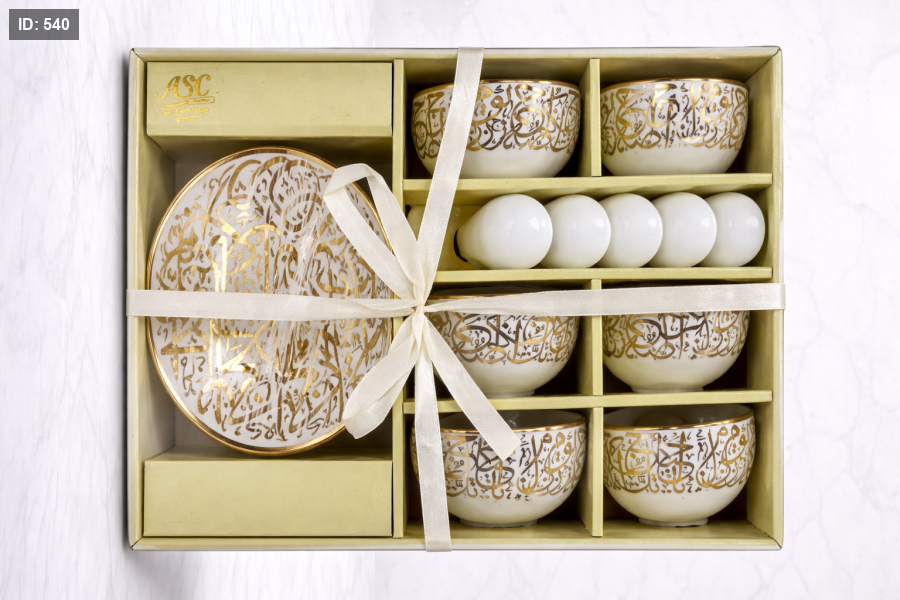 طقم ضيافة بورسلان مزخرف بخط عربي ذهبي